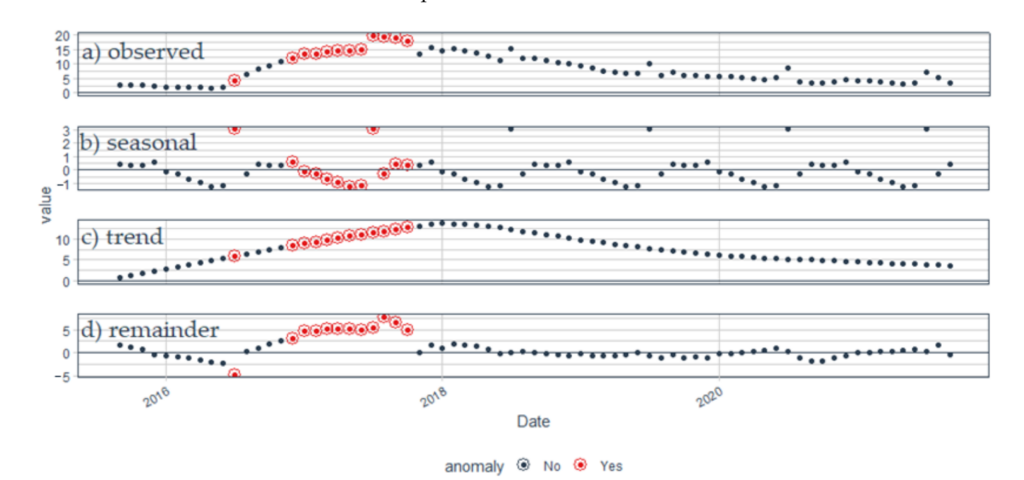 Research on surge-type glaciers, although they constitute a small percentage of all glaciers, significantly contributes to understanding glacier flow mechanisms. Recent studies have utilized remote sensing techniques to unravel these processes, highlighting the potential of combining high-performance computing and earth observation. While modeling surge events has gained popularity, there is a lack of comprehensive spatial and temporal data on surge timing. To address this, an algorithm has been developed that not only detects surge-type glaciers but also determines the onset of surges. The algorithm relies on time series analysis of glacier surface velocity using Sentinel-1 data, involving seasonal and trend decomposition and outlier detection via the General Studentized Extreme Deviate Test. Cluster analysis is then applied to identify outlier clusters associated with glacier surges. The method’s effectiveness was demonstrated in the Svalbard archipelago between 2015 and 2021, where 18 glacier surges and their timing were successfully identified.